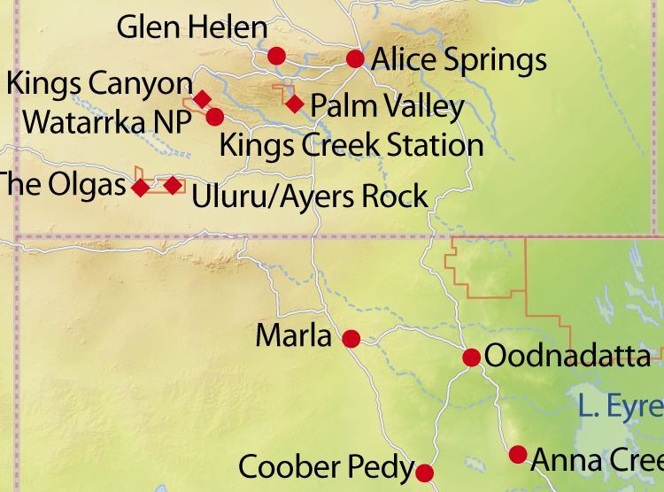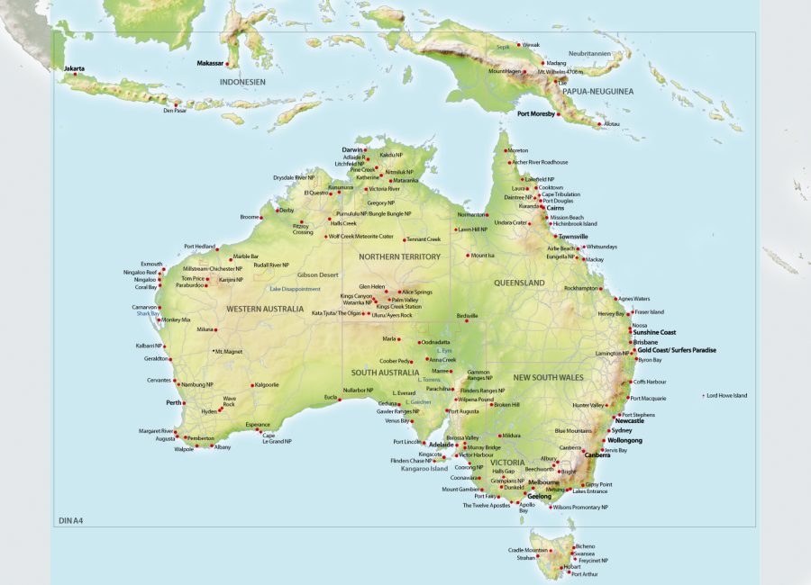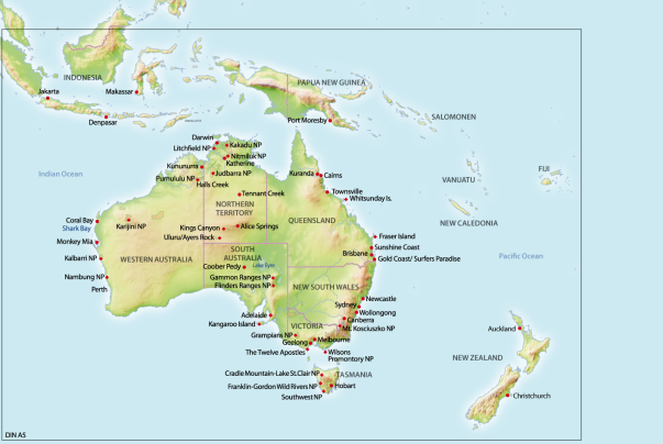 editierbare Layer: Küstenlinie, Gewässer, Staats-grenzen, Textebenen: Cities, Towns, Nat-Parks